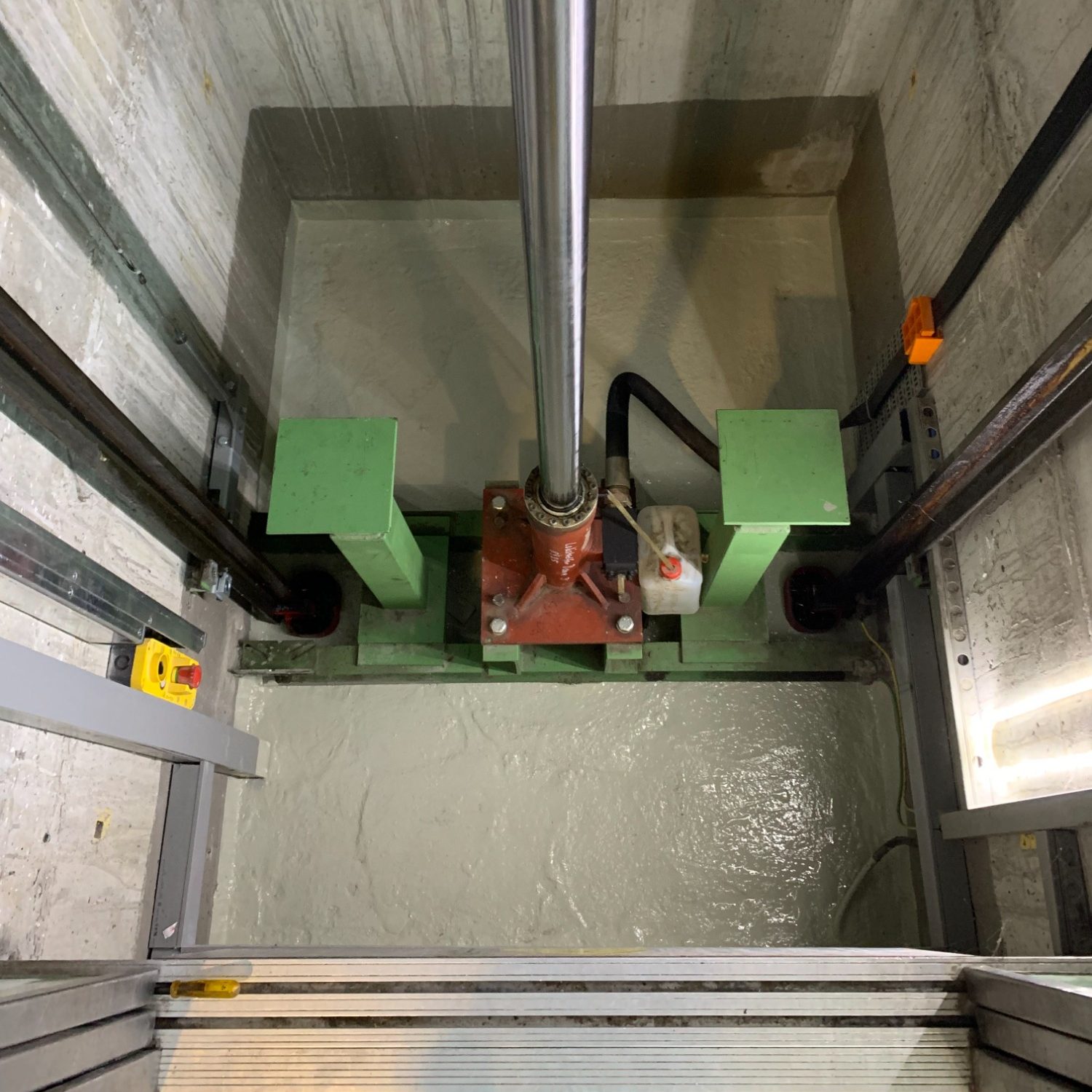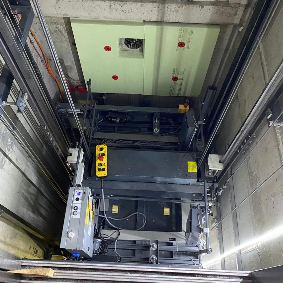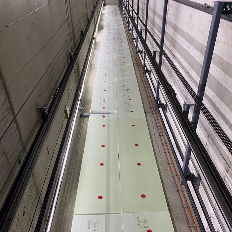 Zur Einhaltung der DIN EN 81-20 wurden an der Schachtwand Absturzsicherungen angebracht, die den Arbeitsbereich/Nutzungsbereich zuverlässig sichern