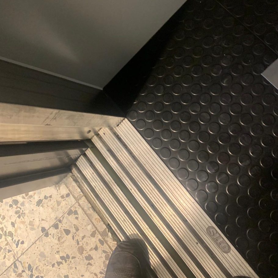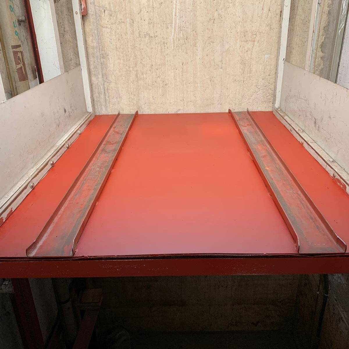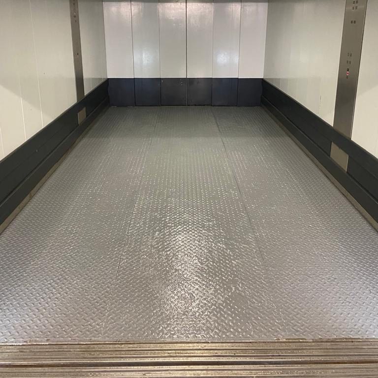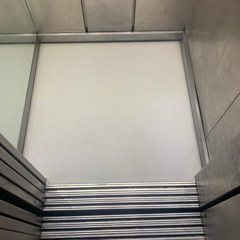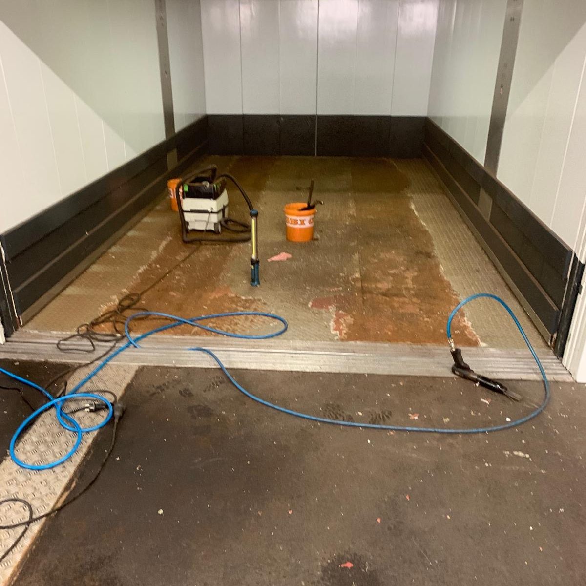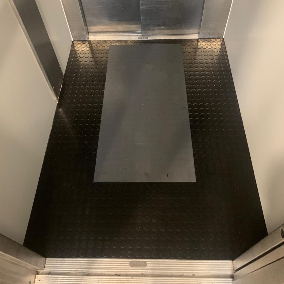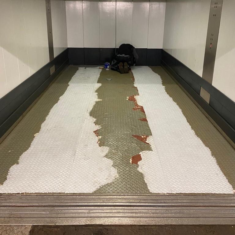 Demontage des bestehenden Stahlbodens und Einbau eines neuen Edelstahlbodens im Autoaufzug