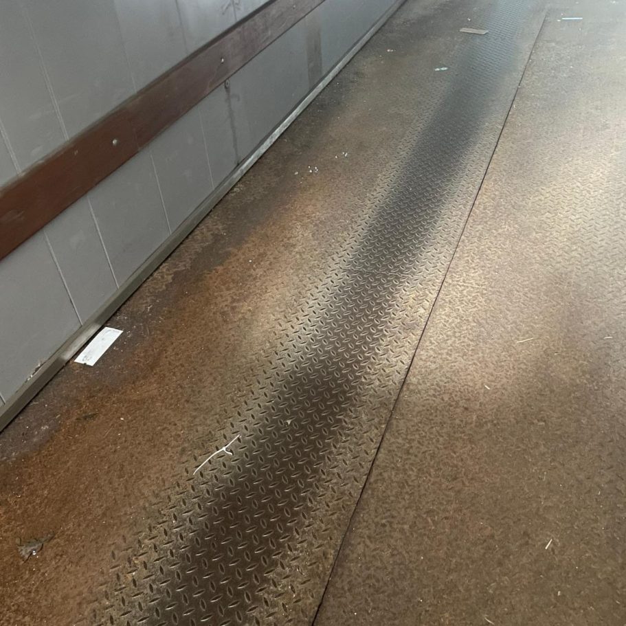 Rostbefallene metallische Oberfläche aufbereitet, mit Rostschutzfarbe versiegelt und danach den neuen Bodenbelag verklebt