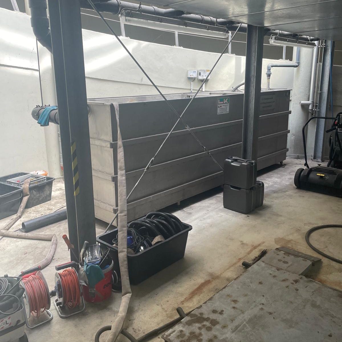 Die mit Wasser gefüllte Grube wird vollständig abgepumpt und anschließend gründlich trockengelegt, sodass der Bereich wieder für Wartungsarbeiten nutzbar ist